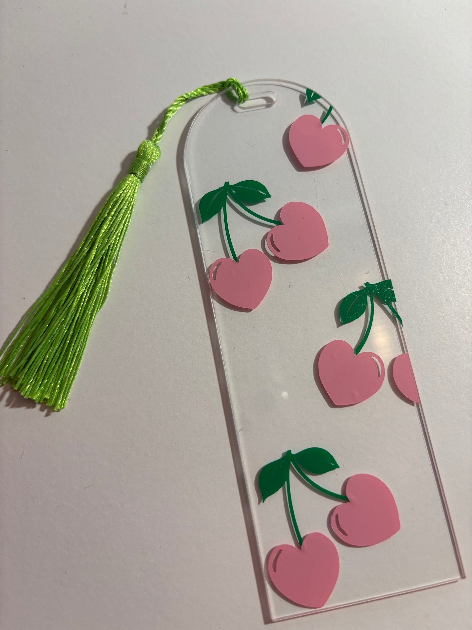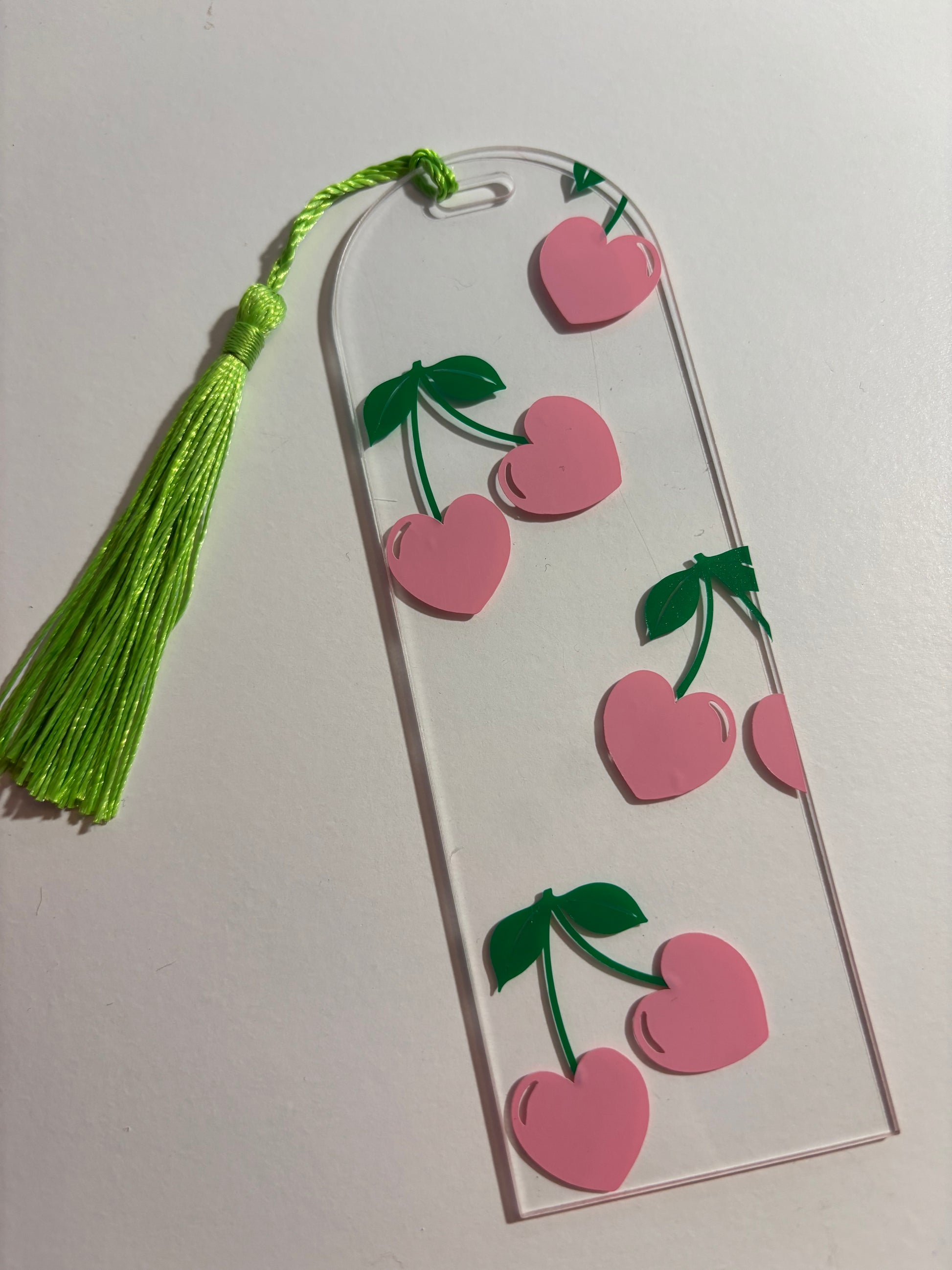 Brighten up your reading time with this adorable Heart Cherry Acrylic Bookmark! Made from durable, crystal-clear acrylic, it features playful pink heart-shaped cherries with lush green leaves, bringing a sweet pop of colour to your favourite book. The vibrant lime-green tassel adds a touch of charm while making it easy to find your page.